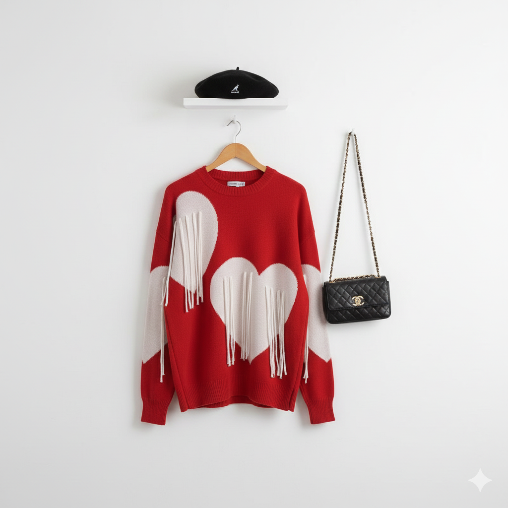 Wrap yourself in cozy charm with this soft blushing heart sweater, designed to stand out with playful heart motifs and statement fringe detailing. The bold white hearts are accented with delicate tassel fringes that add movement and a touch of whimsy to the look. Crafted in a warm, comfortable knit with a relaxed silhouette, this sweater is perfect for chilly days when you want comfort without compromising on style. Pair it with jeans, skirts, or layered winter fits for an effortlessly cute and cozy vibe.