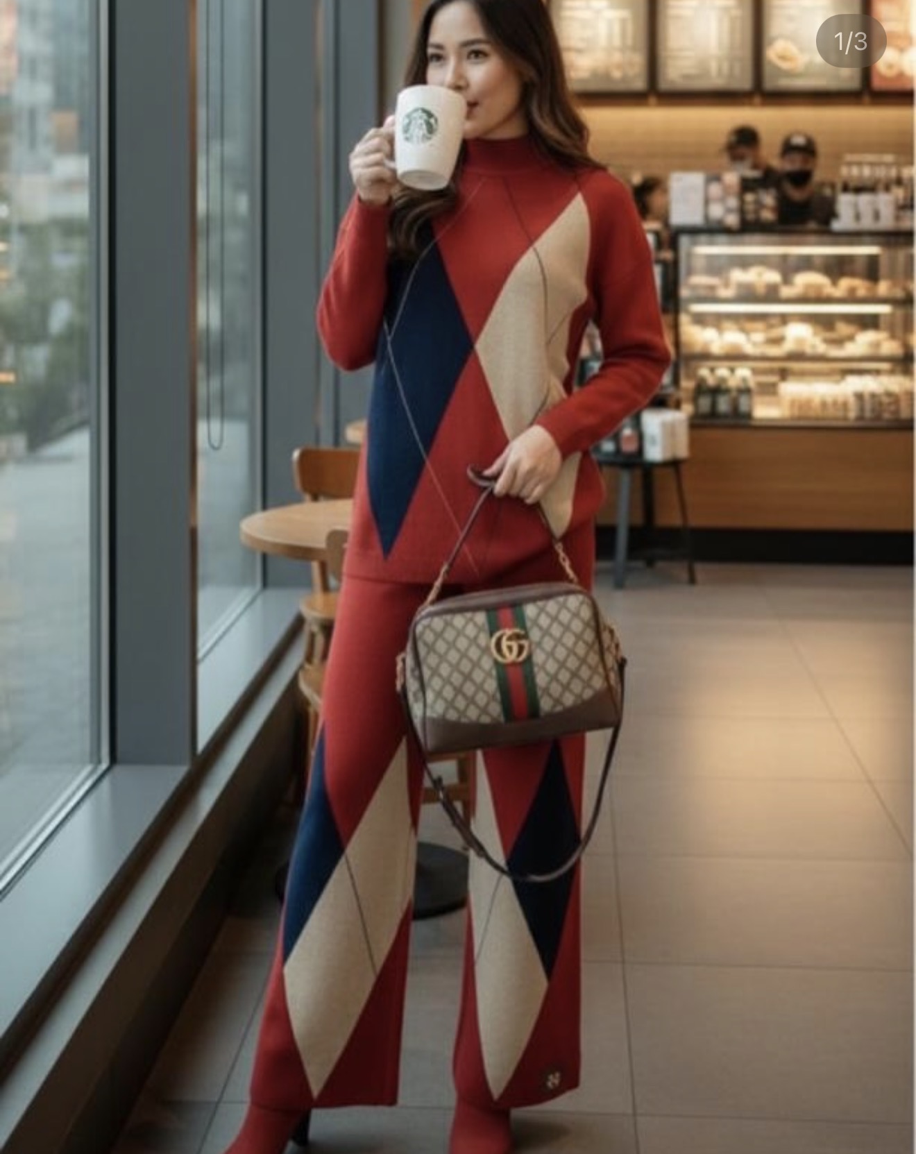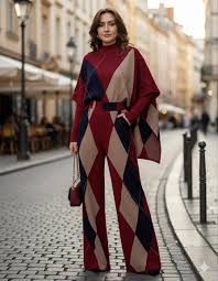 Idoo Geometric Knit poncho And Warm Pants Coord Set