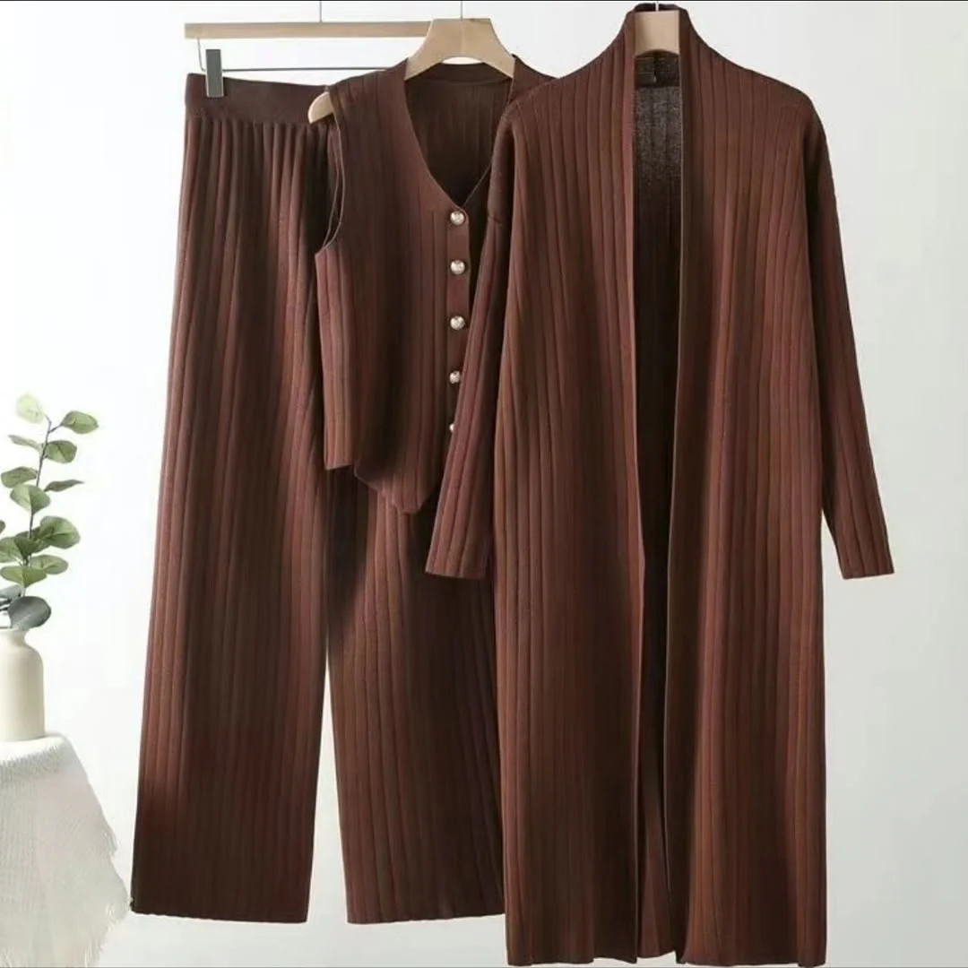 Jess three piece Knit long coat , top, Warm Pants Coord set