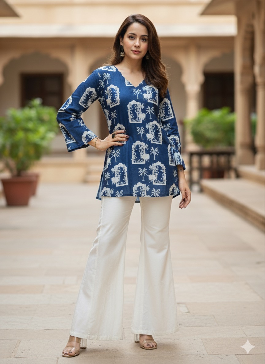This ensemble is the perfect blend of traditional artistry and modern-day comfort. The Chanderi top is lightweight, breathable, and carries the natural sheen that Chanderi fabric is loved for. Adorned with a striking Nandi motif print, inspired by Indian heritage and temple architecture, the design brings cultural depth while still being playful and contemporary. The straight, relaxed silhouette with full sleeves ensures ease of wear, making it a versatile choice for day-to-evening styling.