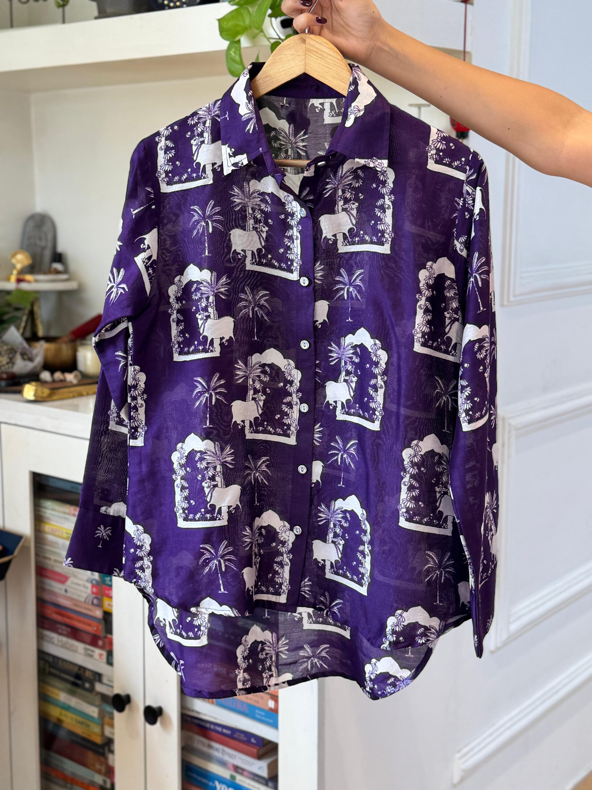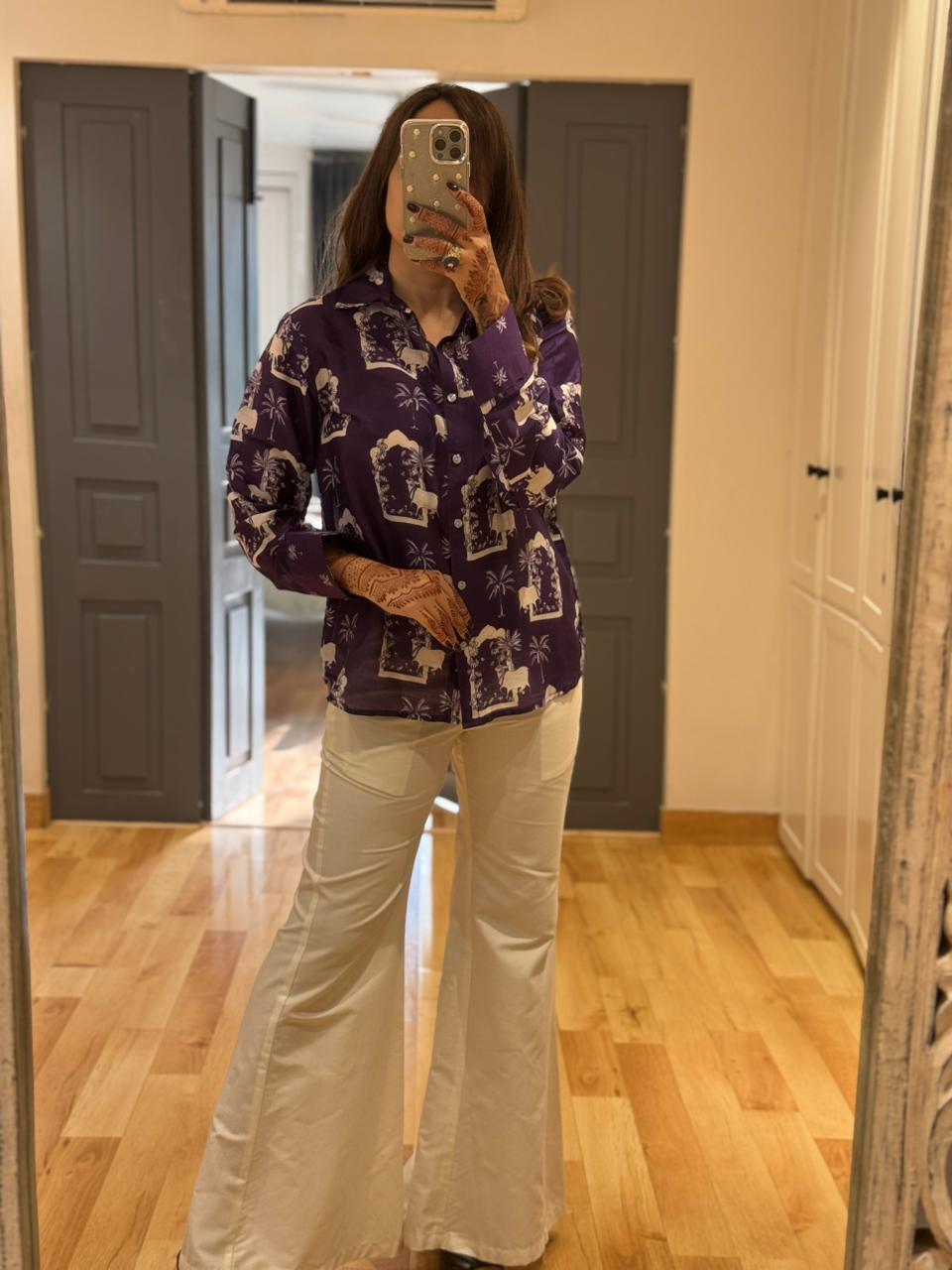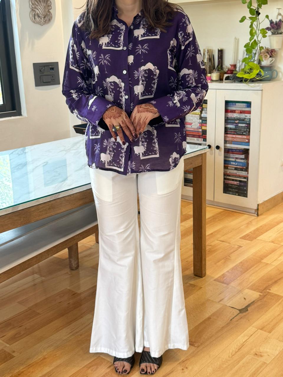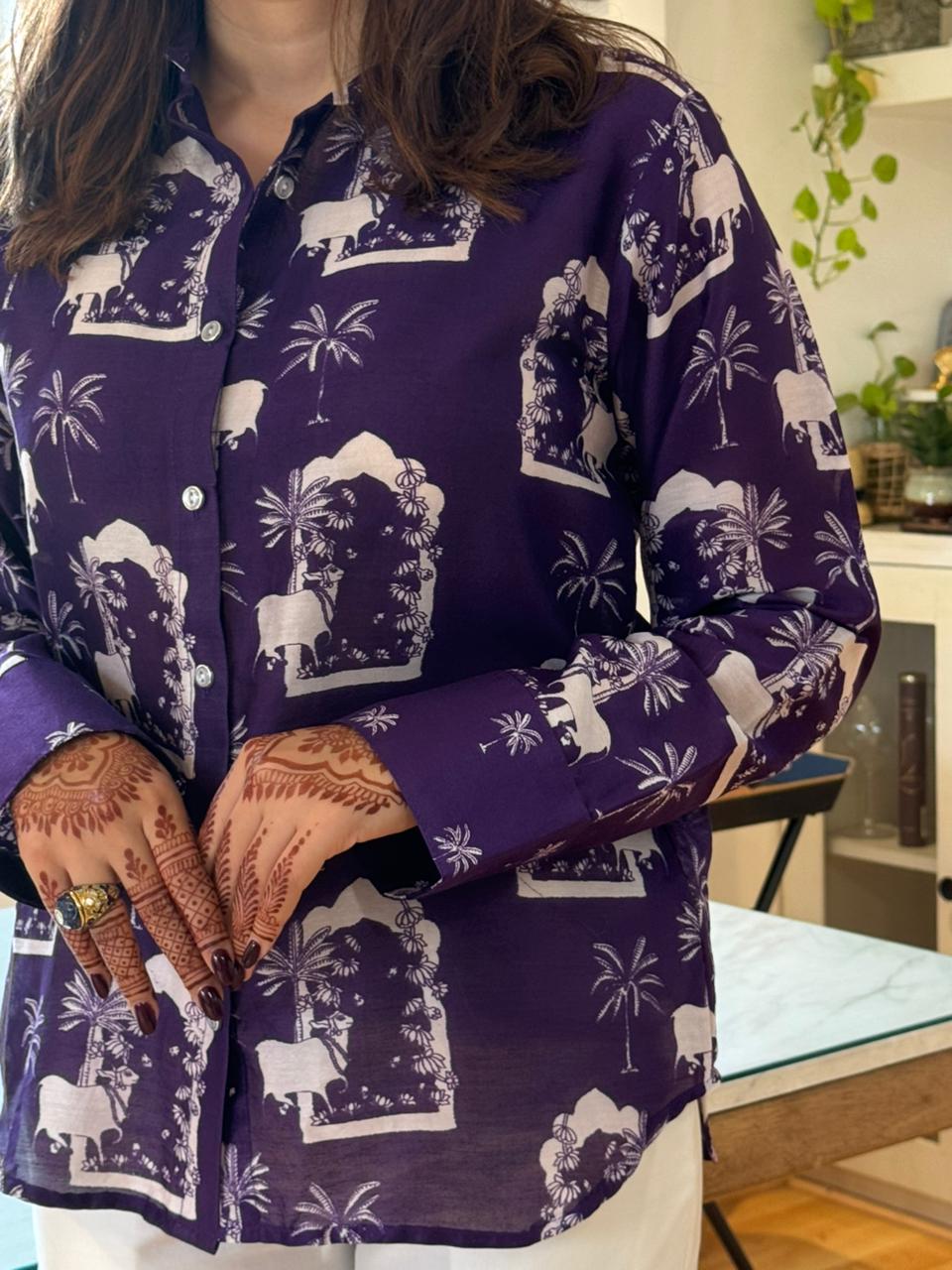 This Ensemble Is The Perfect Blend Of Traditional Artistry And Modern-Day Comfort. The Chanderi shirt Is Lightweight, Breathable, And Carries The Natural Sheen That Chanderi Fabric Is Loved For. Adorned With A Striking Nandi Motif Print, Inspired By Indian Heritage And Temple Architecture, The Design Brings Cultural Depth While Still Being Playful And Contemporary. The Straight, Relaxed Silhouette With Full Sleeves Ensures Ease Of Wear, Making It A Versatile Choice For Day-To-Evening Styling.