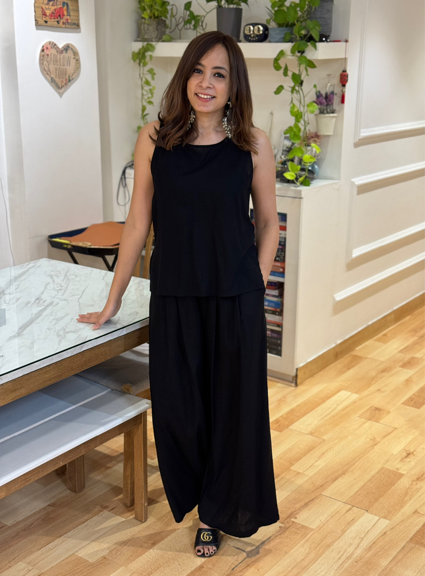 The set features a sleeveless, easy-fit top paired with wide-leg trousers. The trousers come with functional side pockets, adding everyday practicality to this refined silhouette.