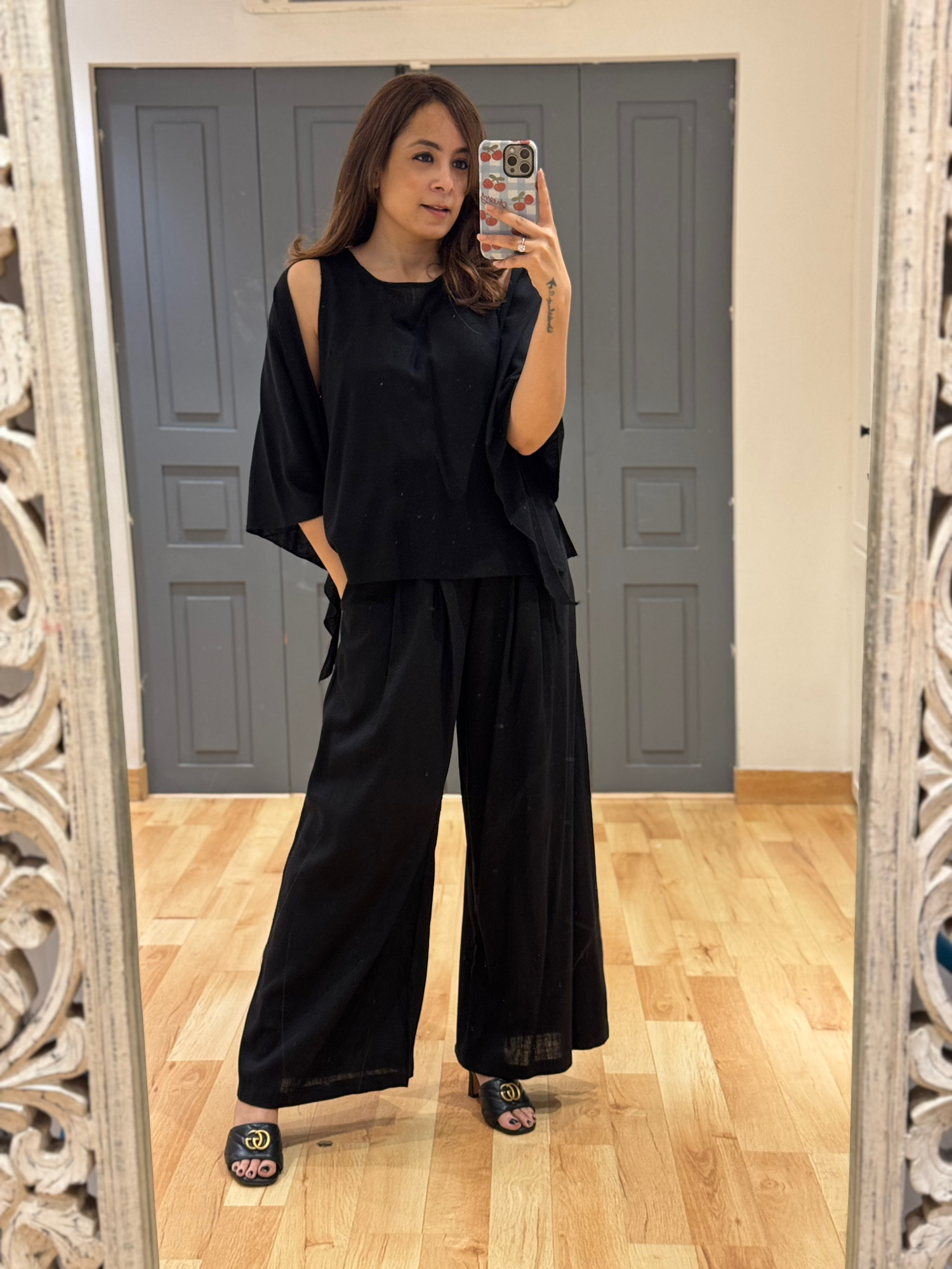 What makes this set truly special is its detachable drape (scarf). Designed with button closures on the top, the drape can be attached to create soft sleeve coverage for a more structured look. Unbutton it and wear it around your neck, let it flow over your arms, or style it your own way — giving you multiple looks in one outfit.